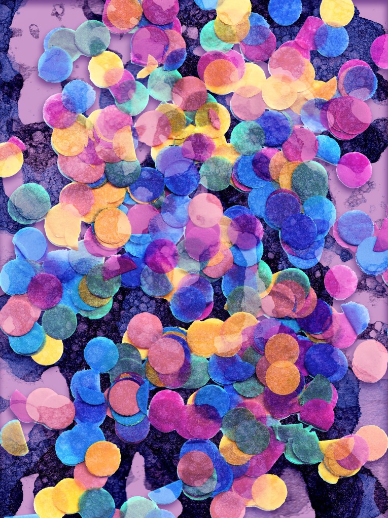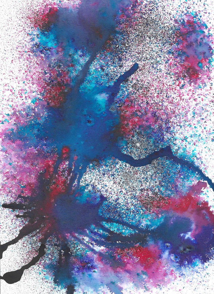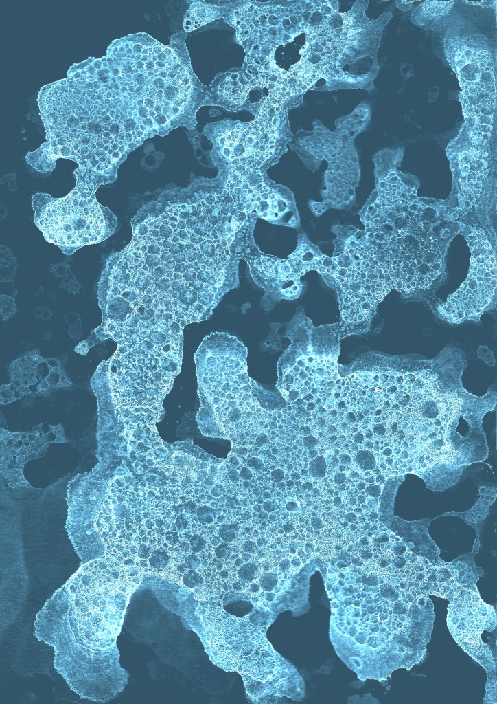 I had a lot of fun experimenting with just making visual textures, something I hadn’t really delved into all that much. I was reminded of an art project I did as a small child, where you’d put food dye and fairy-liquid into water. Then you’d put the tip of a straw into the water and blow. Colourful bubbles would form at the surface, and you could print these onto paper if you were careful with gently placing the paper on top. I did this but with black acrylic paint, then I scanned in the dried bubble prints and played around with digital editing. The image in the middle was made by simply dropping confetti onto the glass of my scanner. Then the image on the right was made using watercolour pigment powders and a spray water bottle.