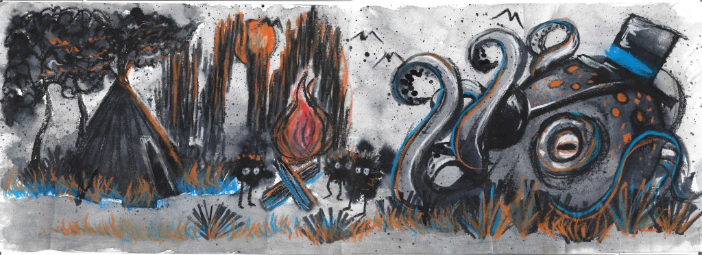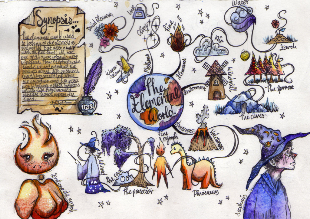 These are some water-colour sketches that I quickly made to get used to drawing various elements of the story. This was my first attempt at drawing a splash and bubbles, which I was feeling intimidated by initially. But doing these sketches made me feel a lot more confident to attempt to illustrate objects that I wasn’t so familiar with initially. I also got an idea for what kind of colour-schemes I was wanting to use.