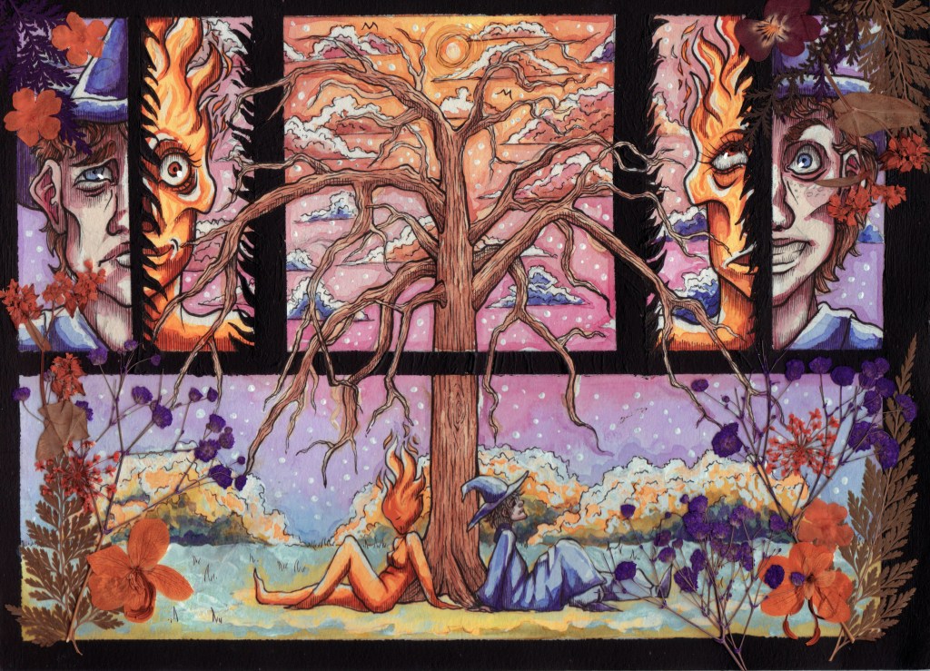 I created these comic panels using a mixture of fine liner pens, watercolours and masking fluid. I decided to make the branches of the tree pop out from the main panels, adding a nice layer of perspective. I used some real dry flowers to frame the corners of the panels and used black posca-pens to outline the panels in black.