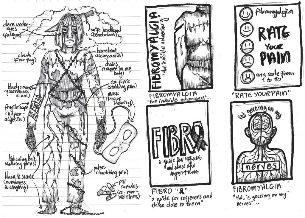 The sketch on the left was a concept for an idea to customise clothing to communicate the struggles faced with the condition. A knife in the head to represent headaches, the chains are the feeling of being trapped in your own body, various paint splatters to represent the different types of pain and fragile tape to convey the delicate nature of the illness.