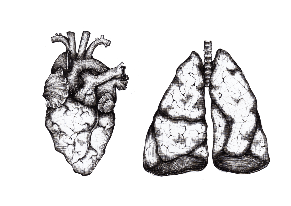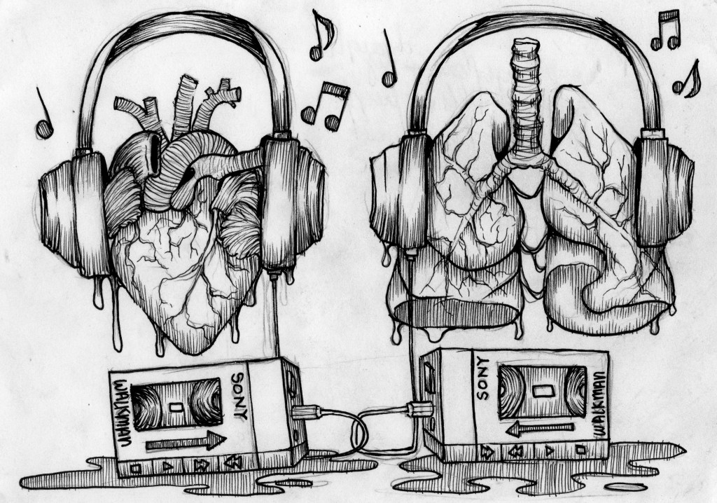 I started working with a medium I was comfortable with; I used fine liners and cross hatching to create the initial design of the lungs, heart, headphones and cassette player. I then went on to create a digital collage with meat and metal textures to create the “collage” versions, and finally I used watercolours to create the final design for the various elements.