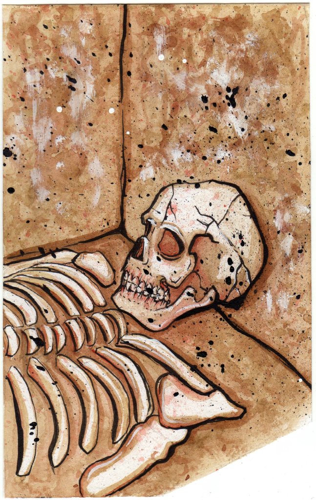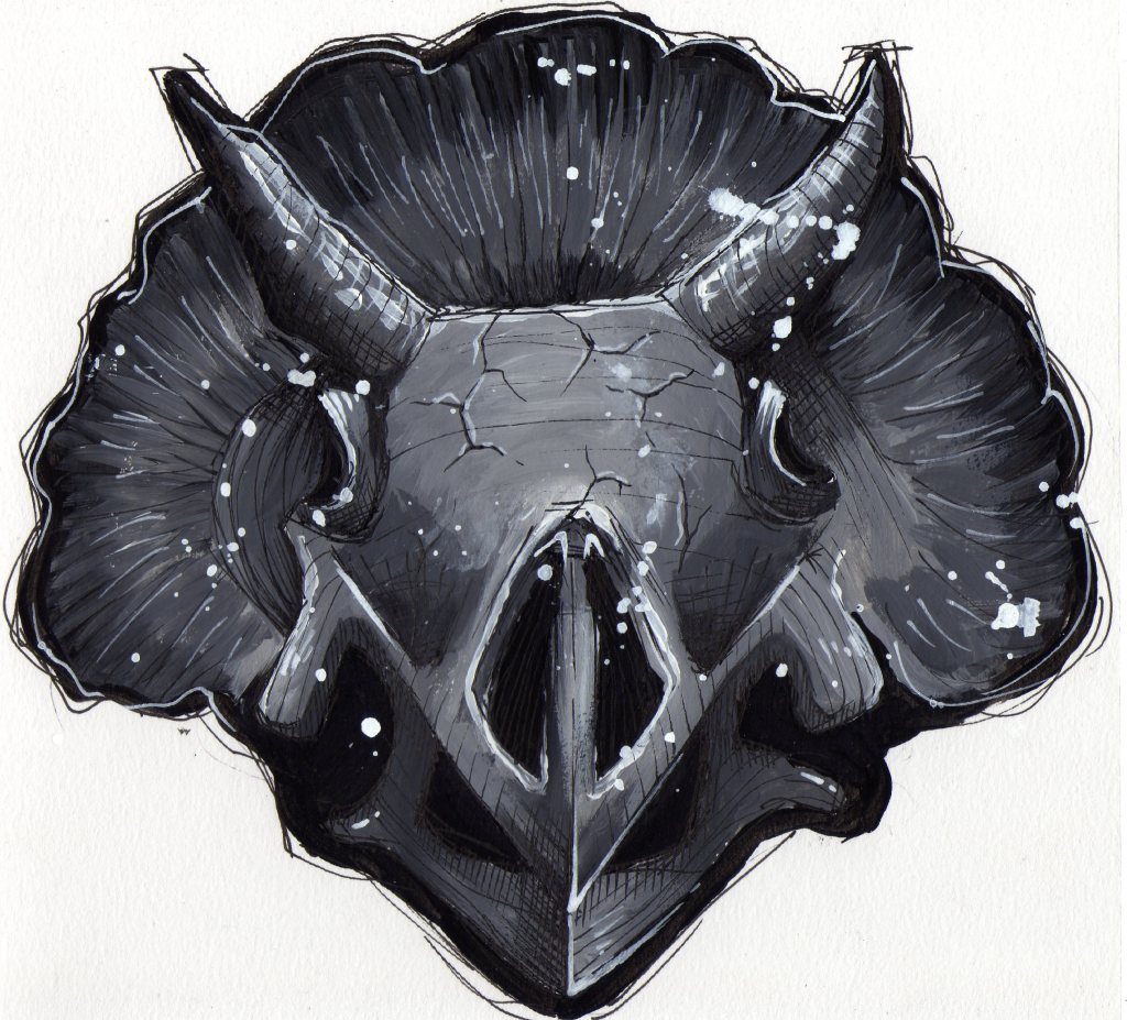 The curving shapes and intricate details really drew me to the Triceratops skull and the human skeleton. For the skeleton, I used watercolour and ink. For the skull, I used acrylic paints and fine liners for detail. I was learning how to create rough but refined paintings quickly, letting go of fixating on every detail.