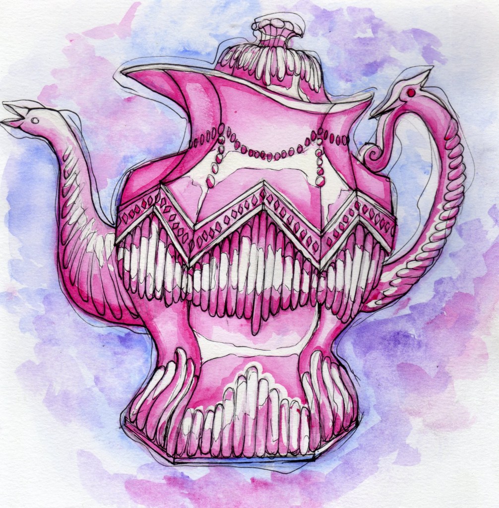 I found this tea-pot to be quite a challenge as I wasn’t very comfortable working with such strong angles and straight lines. However, I was pleased with the outcome. I used watercolours, masking fluid and fine liner pens to achieve the drawing.
