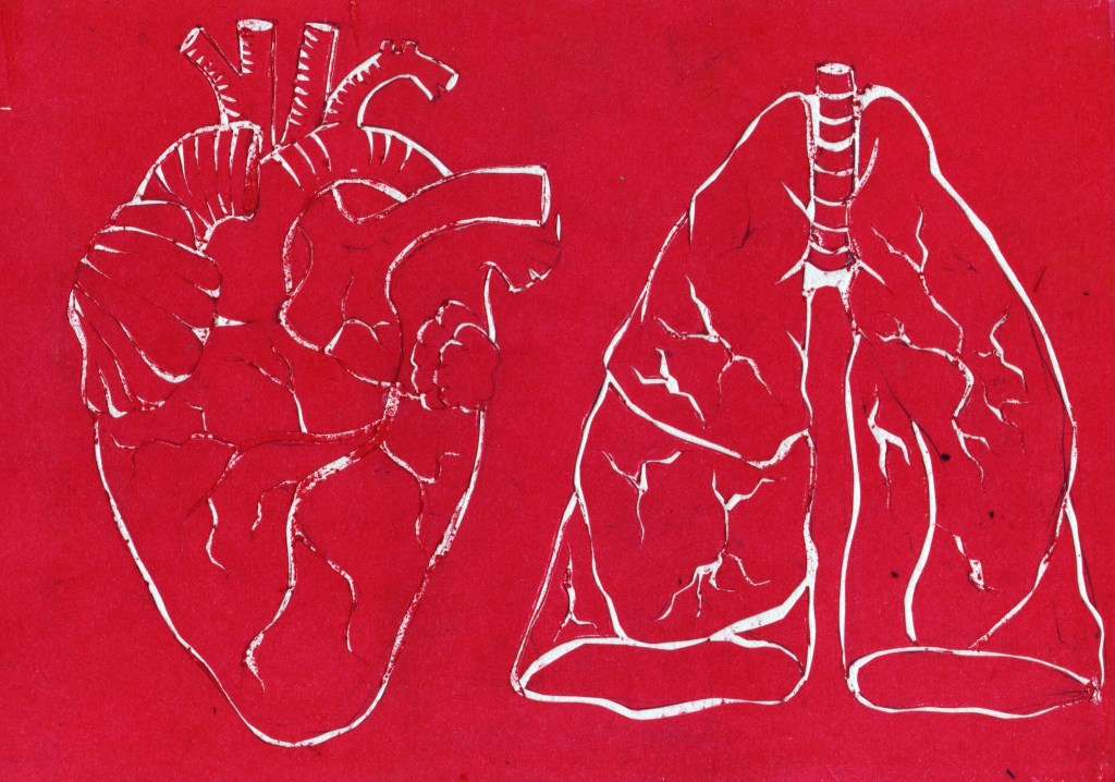 I made two rectangular frames for the heart and lungs, placed them next to each other and then alternated the medium styles and scale of the elements on each frame to create a sense of movement. I also created some outlines of a heart and lungs during a printing workshop. I used this print as a background to the diptychs and also varied the scale and placement of the print to create an unsettling sense of movement.