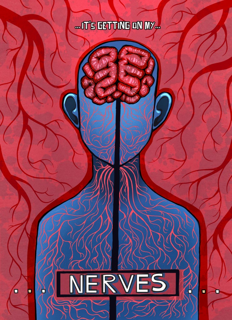 This was the final version of “It’s Getting on my Nerves”. I scanned in the original screen print and imported it into Photoshop, where I corrected the gaps between the layers. I played around with gradients, lighting and the addition of nerves around and inside the head and torso. I felt like they added a feeling of impending pain and distress, like no matter what you do, you can’t escape central nervous system pain.