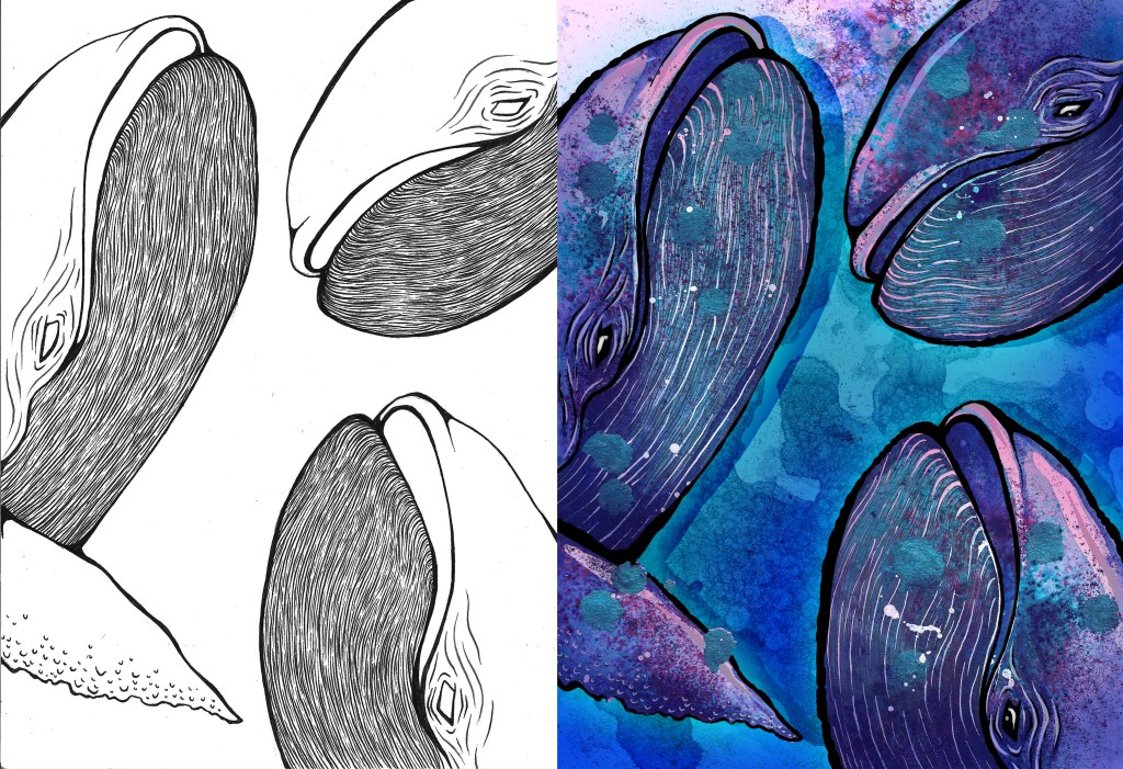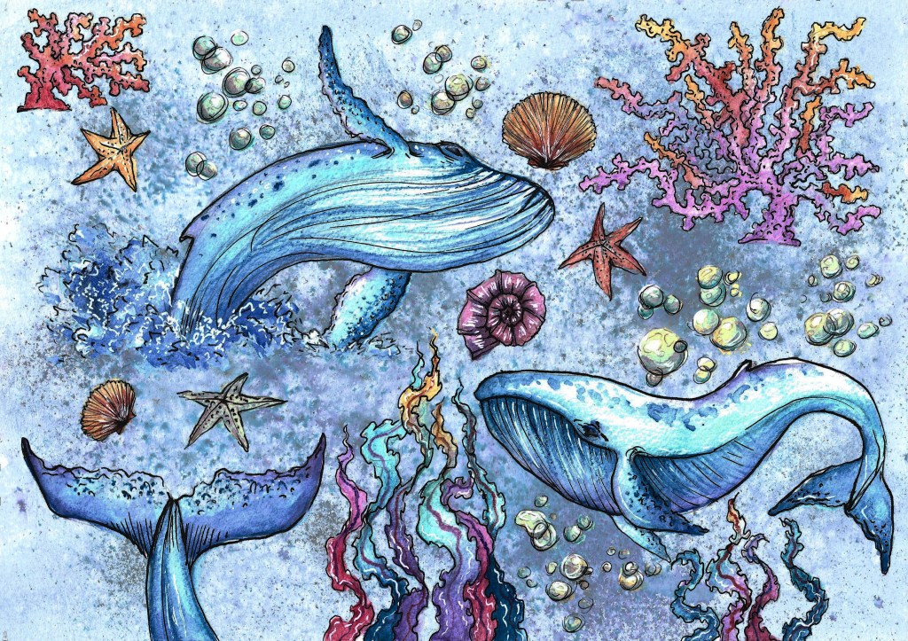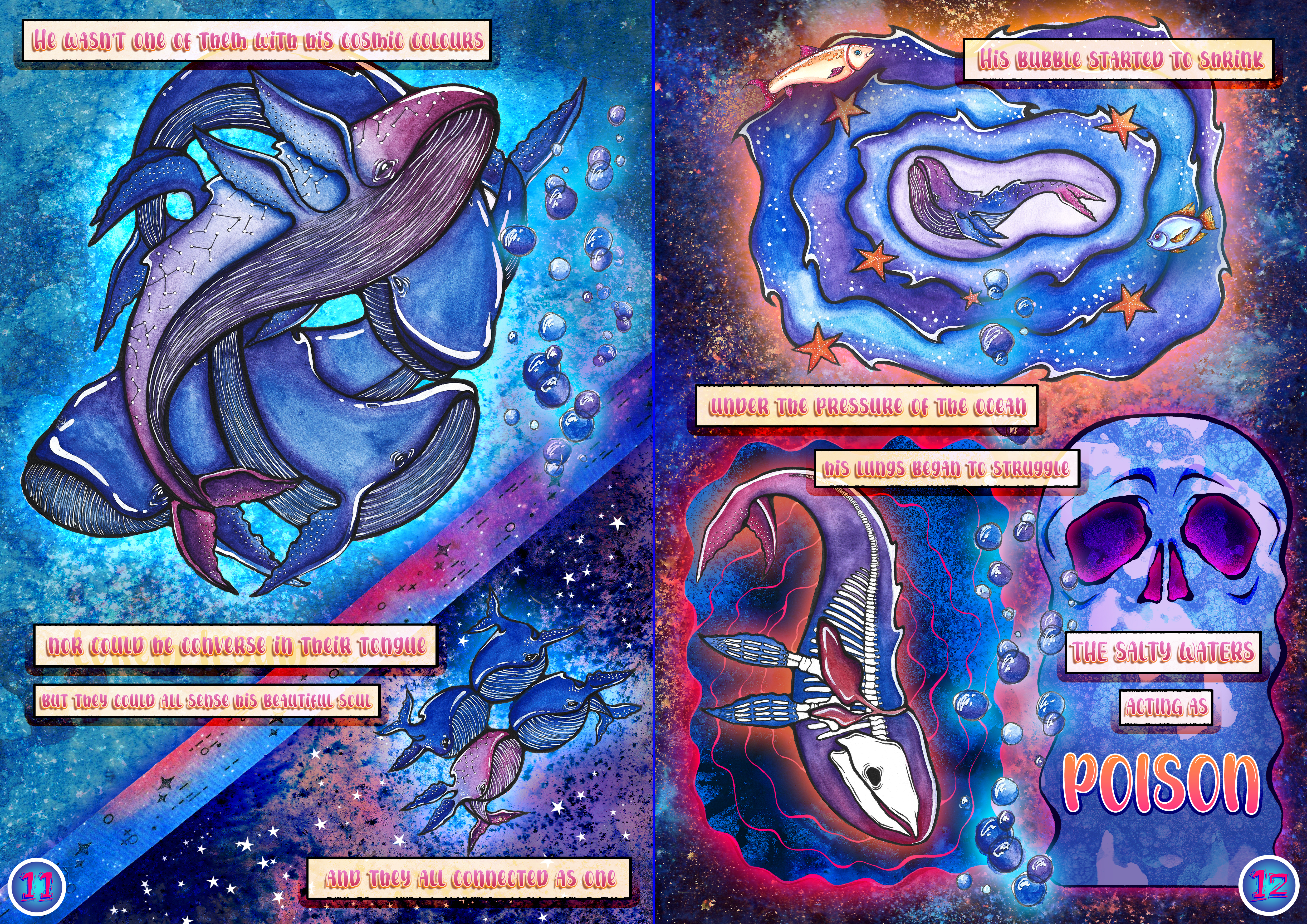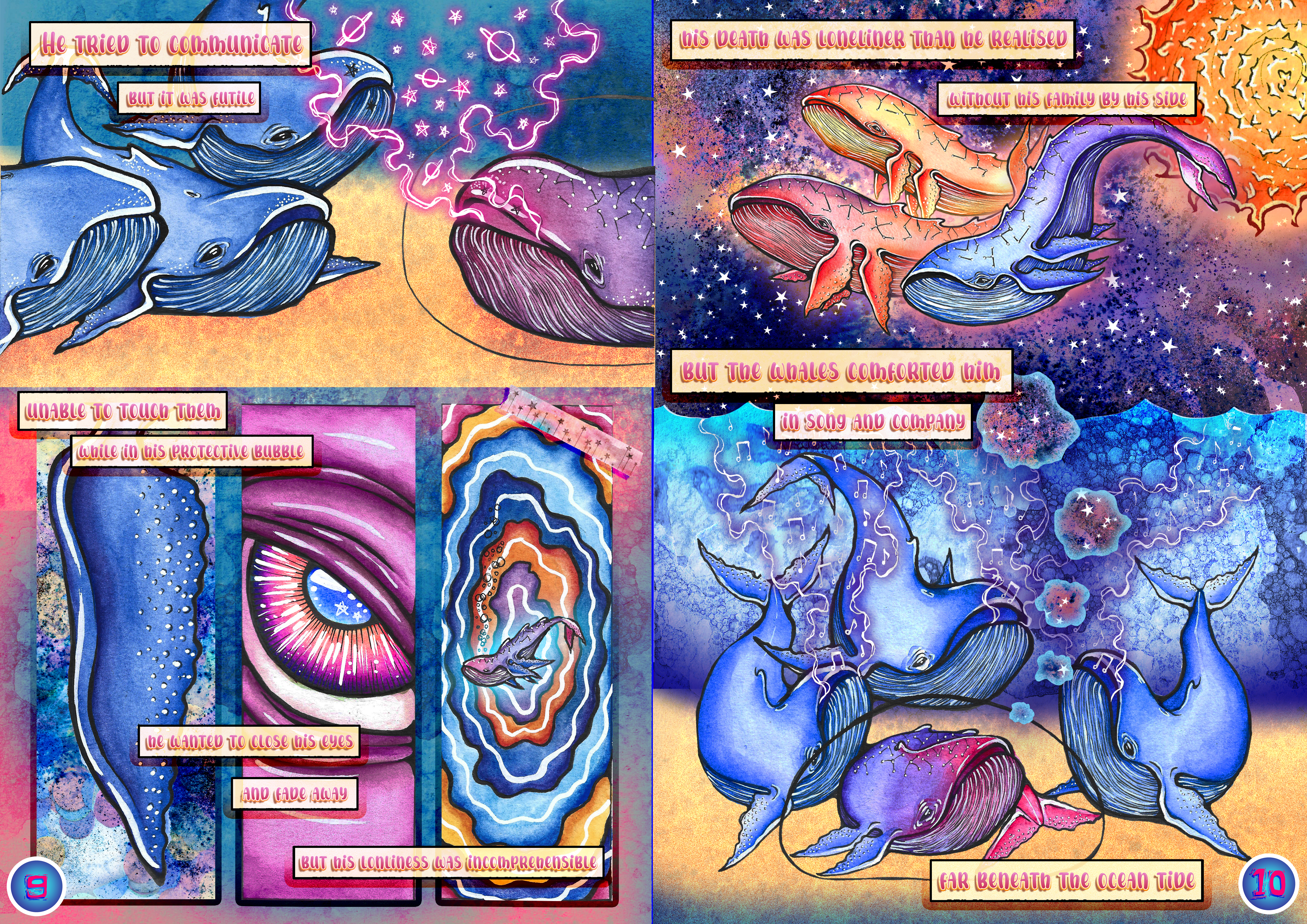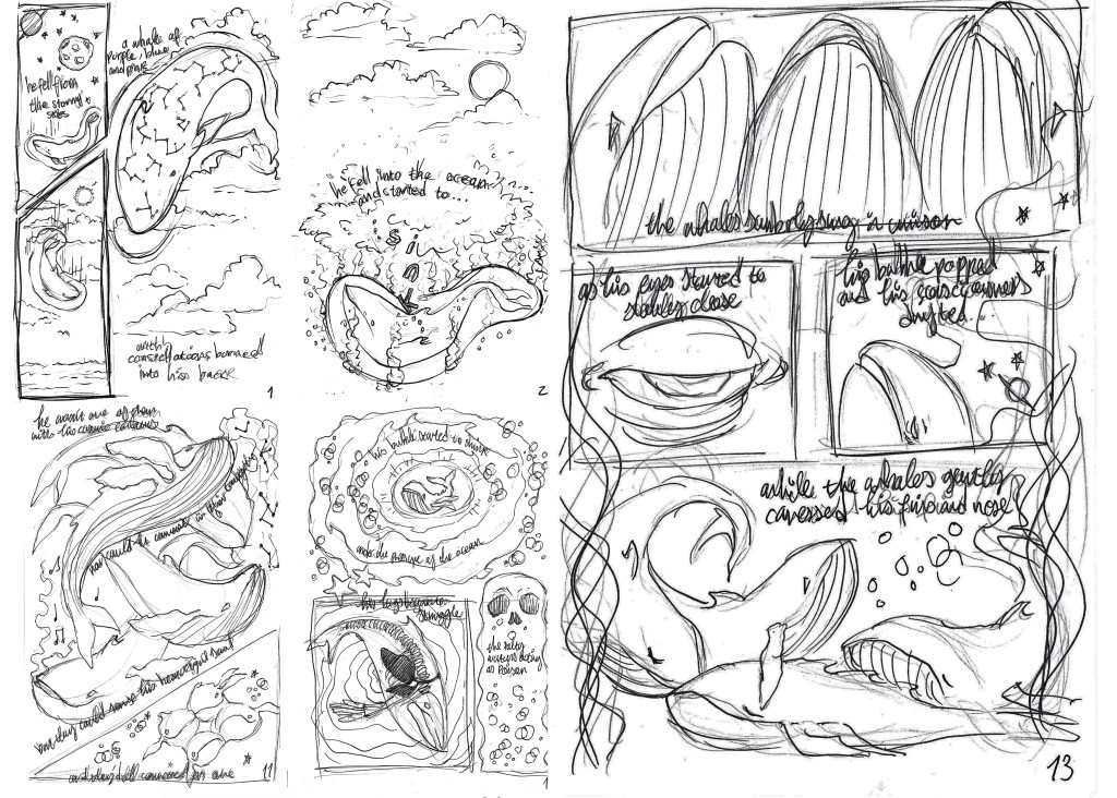 My final project has come to a close, with the completion of my comic, “The Cosmic Whale”. The comic comprises of 18 pages, including the front and back. I created the comic using multiple mediums, including watercolour, paint pens, ink and digital painting and editing.