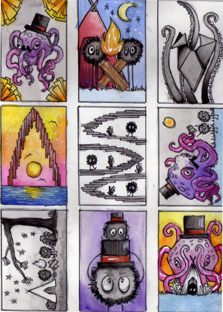 Here is where I was first introduced to making thumbnails to plot out composition, colour and characters from the 3D world. I worked quickly using fine liner pens and watercolour. I learned the importance of sketching and thumbnailing quickly at the offset of this project.