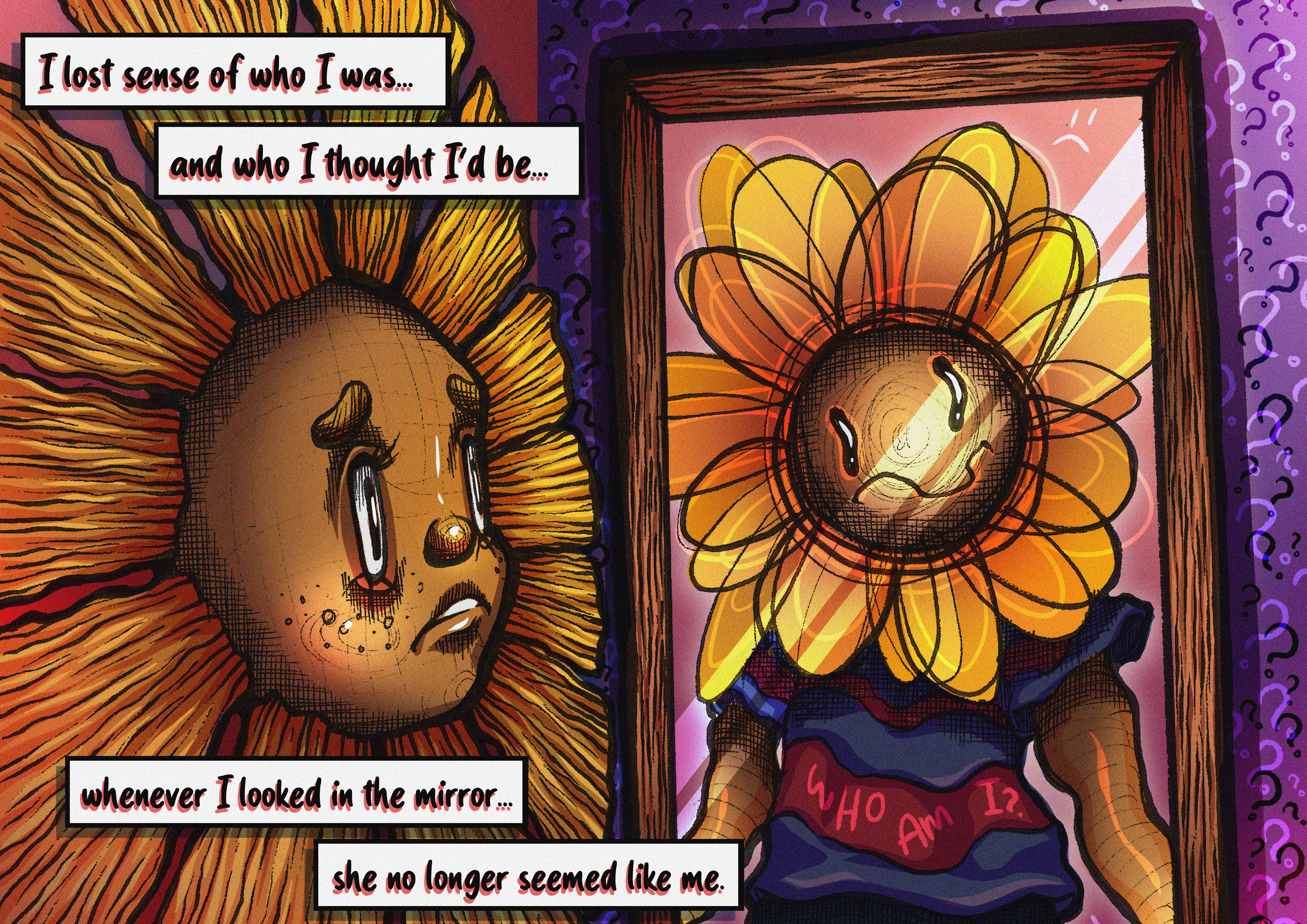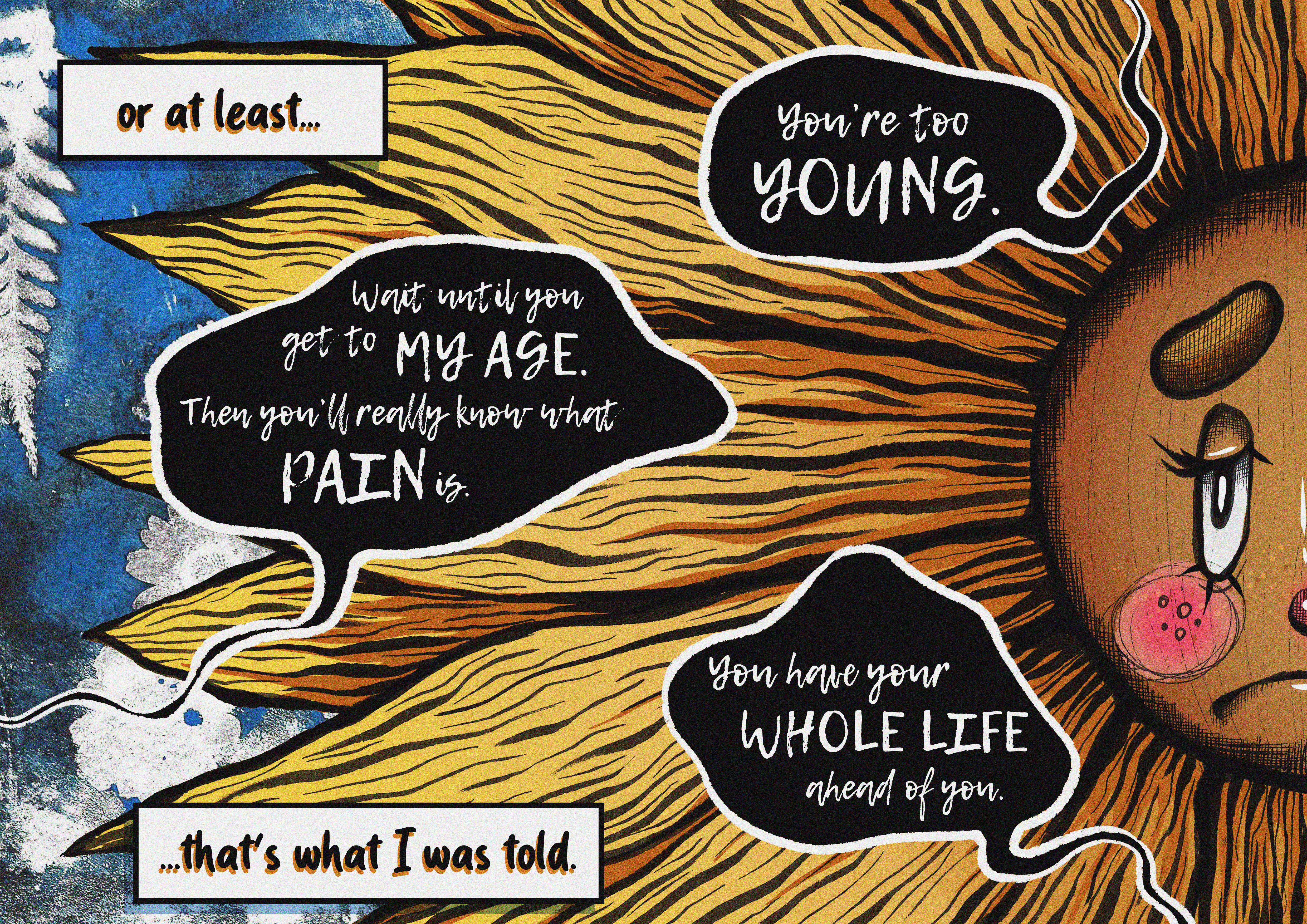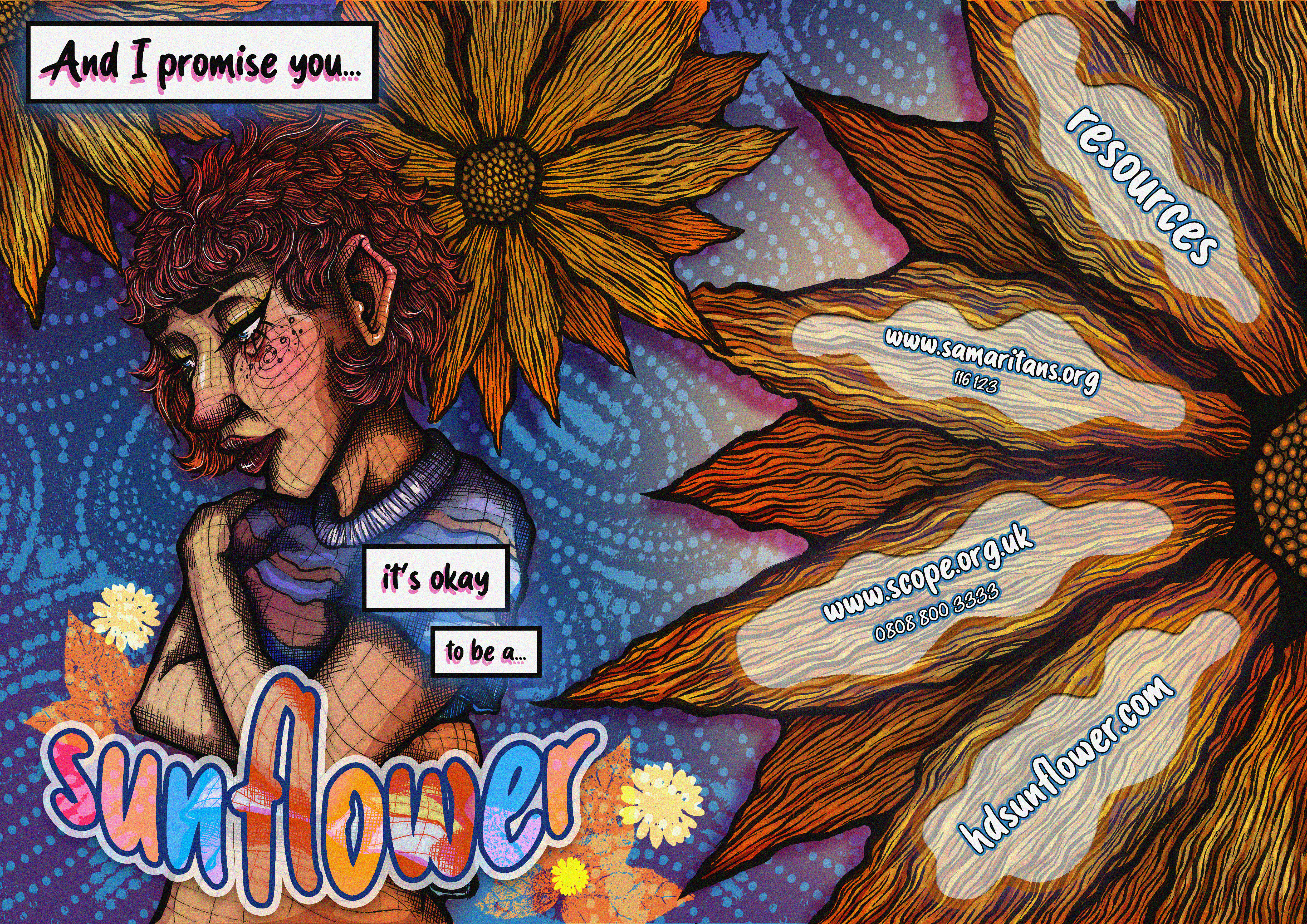 For this project I wanted to create a comic-book focusing on chronic-illness. It would be narrative-driven in the form of poetry, with the main character being a sunflower. I chose a sunflower as it’s the symbol used with invisible disabilities.